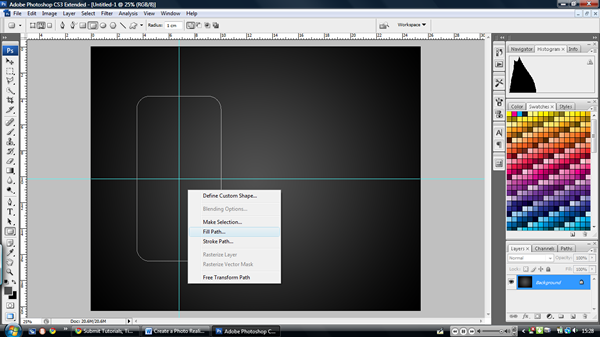 On a new layer; call it "silver side", select the rounded rectangle tool (U) and set it to paths. Make sure its radius is 1cm and then drag from the centre of the guidelines, making sure to hold ‘Alt’ when you drag it. Try and get a realistic shape (If you’re not sure then pull up a reference image from the web).