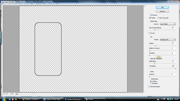 Then go to ‘Filters > Blur > Lens Blur’ and apply the settings below. Make sure that this layer is always on top of all other layers.