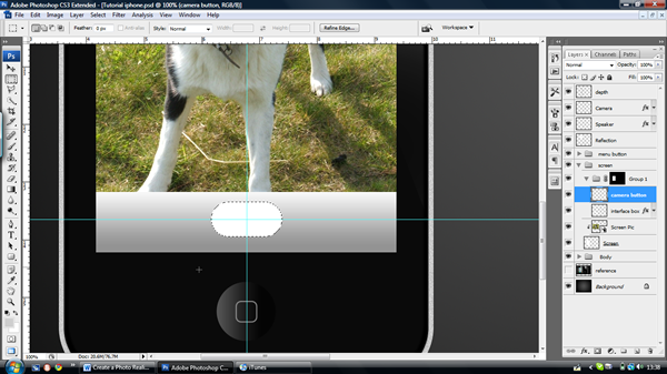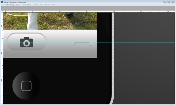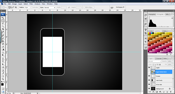 Create a new layer underneath called "Screen." Select the Rectangle marquee tool (M) and then draw from the centre of the guidelines, hold the ‘Alt’ once you have started dragging to make the rectangle expand from the centre. Make the rectangle a nice shape for the screen leaving space for the menu button, speaker and camera. When you are satisfied with the shape of your screen, fill it with any colour and then create a new layer above the "Screen" layer; don’t worry about naming it yet.