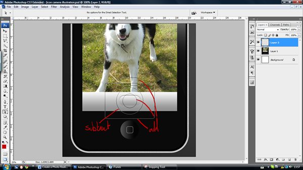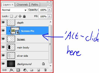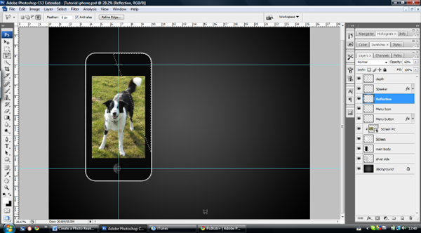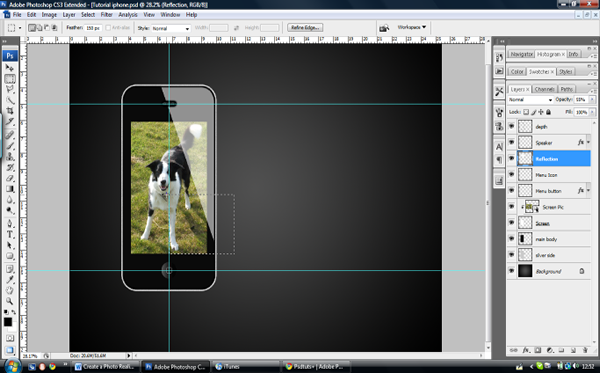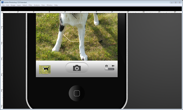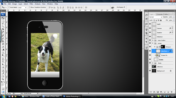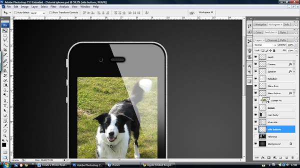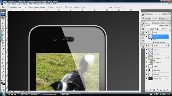 When you are satisfied with the shape of your screen; in your new layer choose ‘File > Place’ and choose a picture of your choice (I’ve chosen my dog – isn’t he cute!) Then resize, move, or rotate the image or do whatever you please to make it look good. Make sure that the image is over the screen when you are finished, you can then rename the layer "Screen Pic." Now, press ‘Alt – Click’ between the "Screen" and "Screen Pic" Layer to make it a clipping layer. This means that it crops to the layer below it and it allows you to edit or change the image underneath with ease.