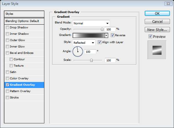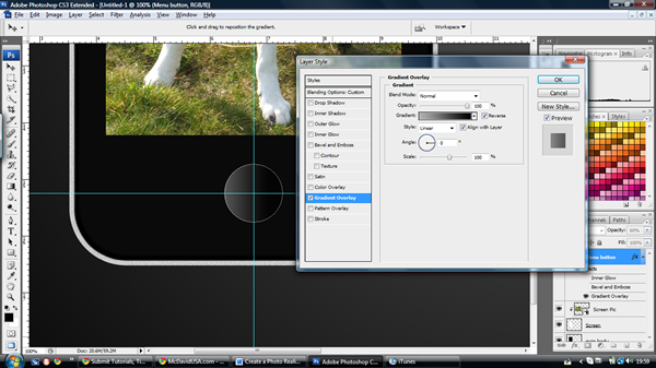 Now we will start on the menu button. Create a new layer and call it "Menu Button", make the opacity 60%. Bring another guideline down to where the button will be and then use the Ellipse tool from the centre of the guidelines holding ‘Alt.’ When you have the desired size, fill it with white then open the layer effects menu by Double-clicking next to the layer, then use the gradient overlay option with #AEAEAE to #000000 as shown below. Remove the path.