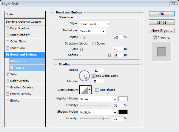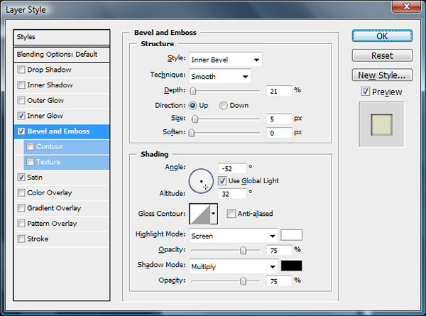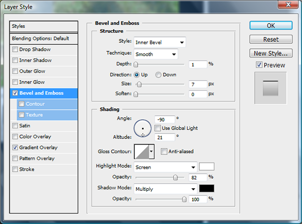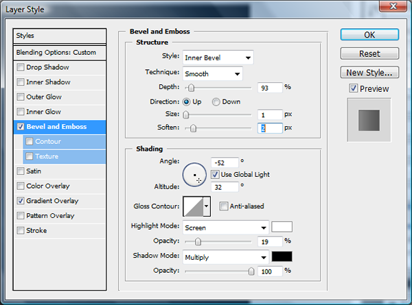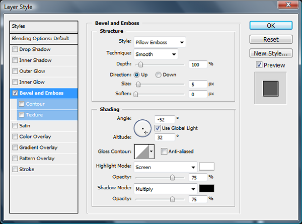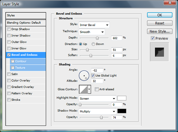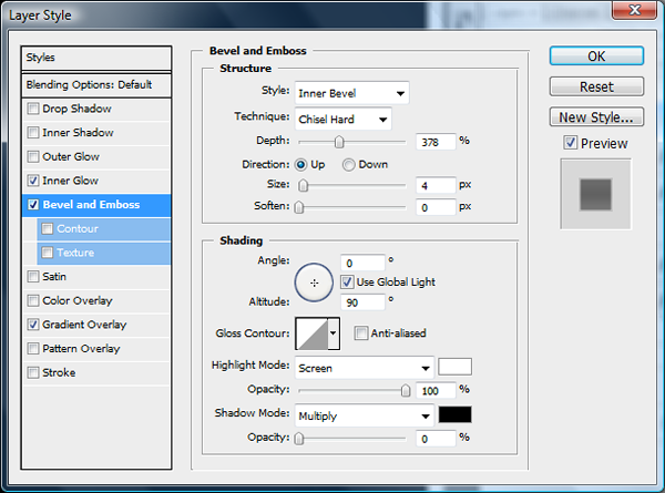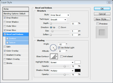 Add the bevel and emboss settings as shown below.