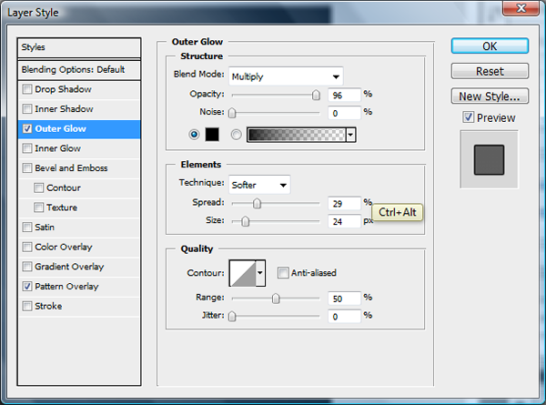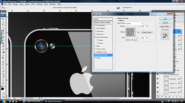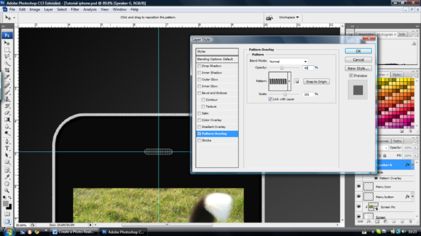 Now to create the speaker, move a horizontal guideline to above the screen, both the speaker and the camera will be centred along this line. Make a new layer called "Speaker" then use the rounded rectangle tool (U) to make the speaker grill. Set the radius to 1cm just to make a rounded edge, and then pull out the shape to the size shown in the pictures below. With the same tool, right click, choose ‘Fill Path’ and fill it with black. Then view the layer effects and choose ‘Pattern Overlay’ and ‘Outer glow’ and use the settings shown.