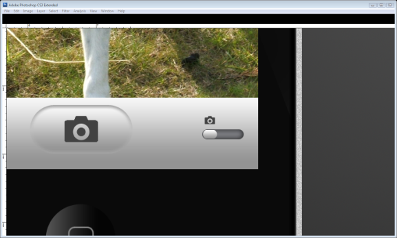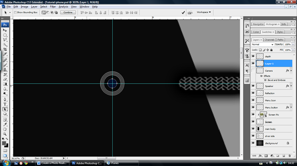 Now we can start on the camera, pull out a guideline to where you want the centre of the camera to be, create a new layer called "camera." Select the Ellipse tool (U) and make three small circles inside one another from the centre of the guidelines. Fill the outside ring with #424242, middle ring #080809 and the centre ring #080F2B.