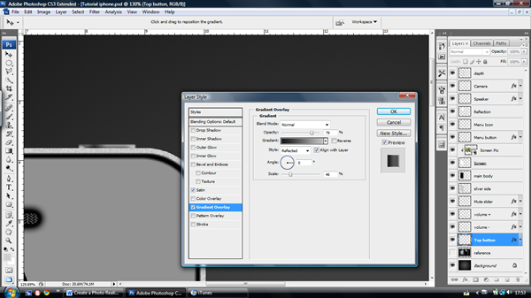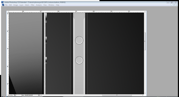 Create a new layer called "volume buttons" and use the elliptical path tool (P) to create two circles the size of the volume button, fill it and apply the settings below. I have used guidelines to make sure that they line up with my side iPhone view buttons.