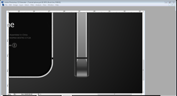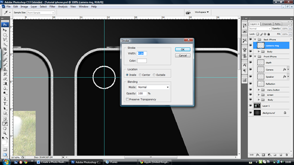 Create a new layer and call it "depth": this is just a line around the inside of the body where the iPhone curves and refracts the light away from the camera. To create the line ‘Cmd/Ctrl – Click’ the "main body" layer, Then go to ‘Edit > Stroke’ WIDTH – 10 pixels, COLOR – #000000, LOCATION – Inside.
