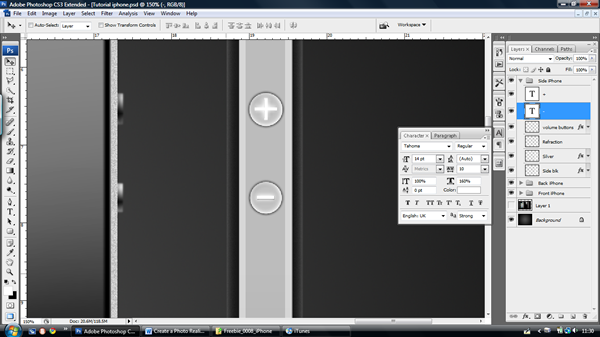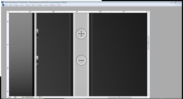 Use the text tool (T) and type a plus and a minus in the buttons, use the Tahoma font at size 14. Make the minus sign wider by increasing the width to 160%. Go to Layer > Rasterize > type (do this to both text layers). Then Cmd/Ctrl – Click the plus and minus layers then go on to the "volume buttons" layer and press delete.